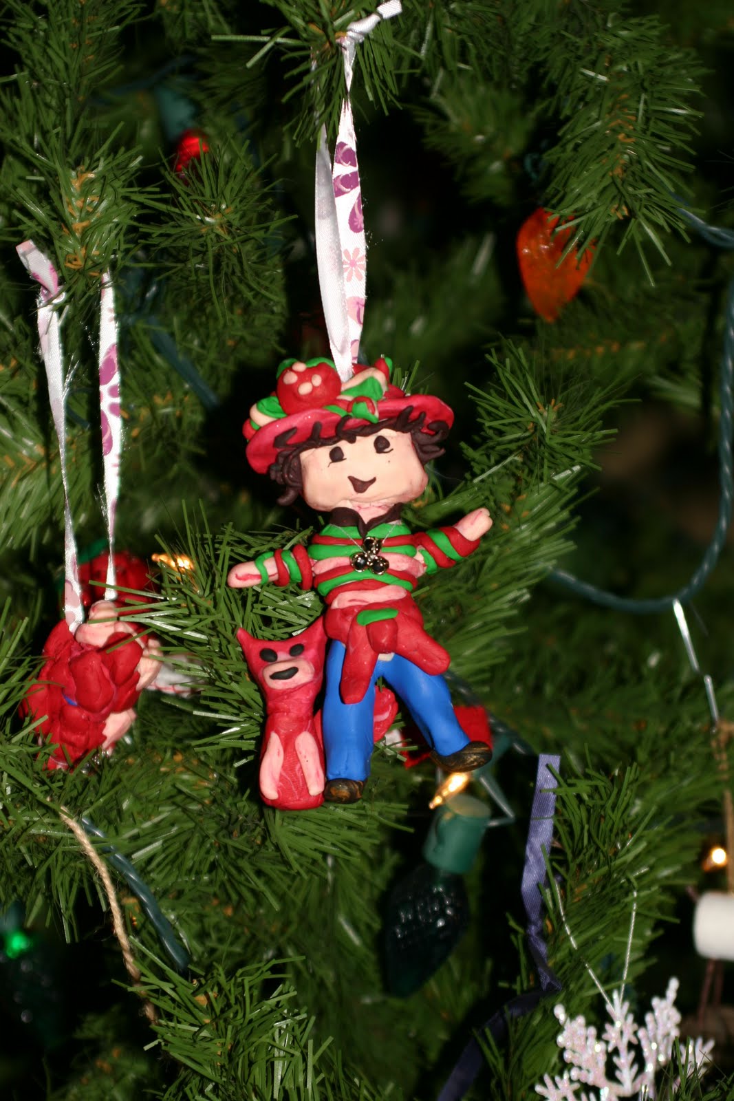 Mommy and auntie Morgan collaborated with Fimo clay to make me a Strawberry shortcake ornament. I made the one next to it (hanging on a separate string), it's Strawberry's dog, Pupcake.